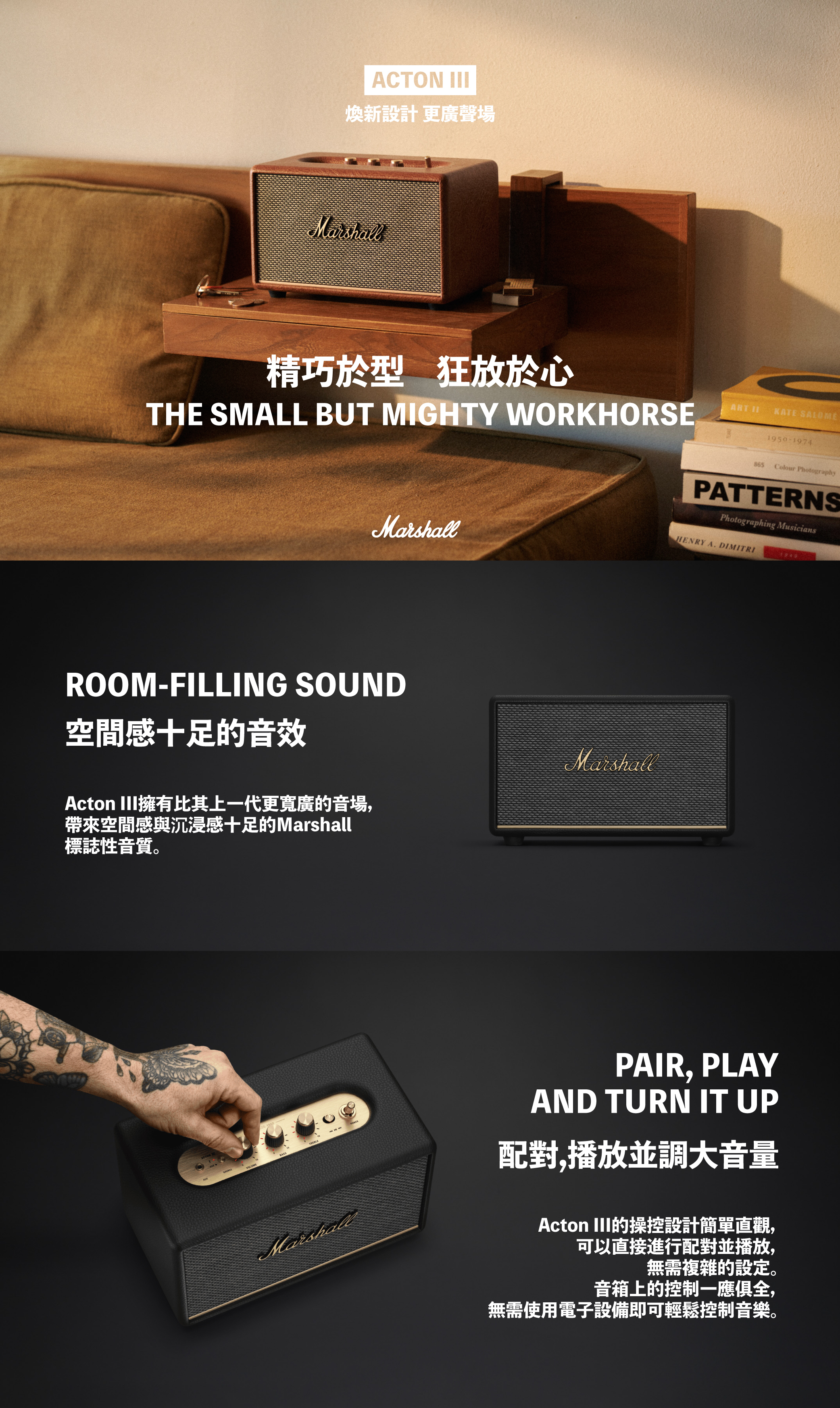 • ActonIII擁有比其上一代更豐富的聲場,經過重新設計,充滿空間感的Marshall標誌性音效得以延續,並帶來更加身臨其境的沉浸式聆聽體驗。